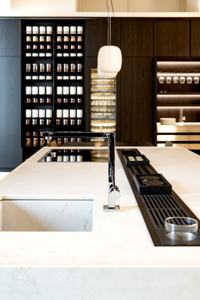 収納家具の製造からスタートしたキッチンなので、アイデアは無限。スパイスラックが並ぶ圧巻のウォールキャビネットは調味料だけではありません。ワインセラーがビルトインできたり、ビバレッジステーション(コーヒーやウィスキー、ワインなど飲み物専用のエリア)を設けたり。キッチン収納が間取りとなり、間取りが美しいインテリアとなるのです。
