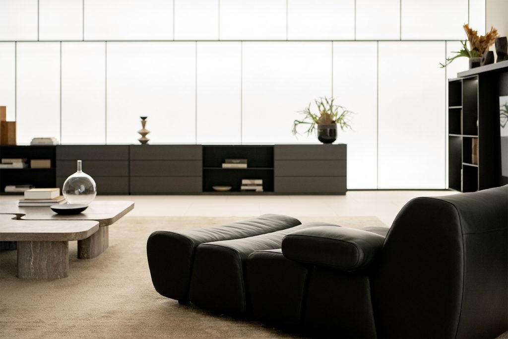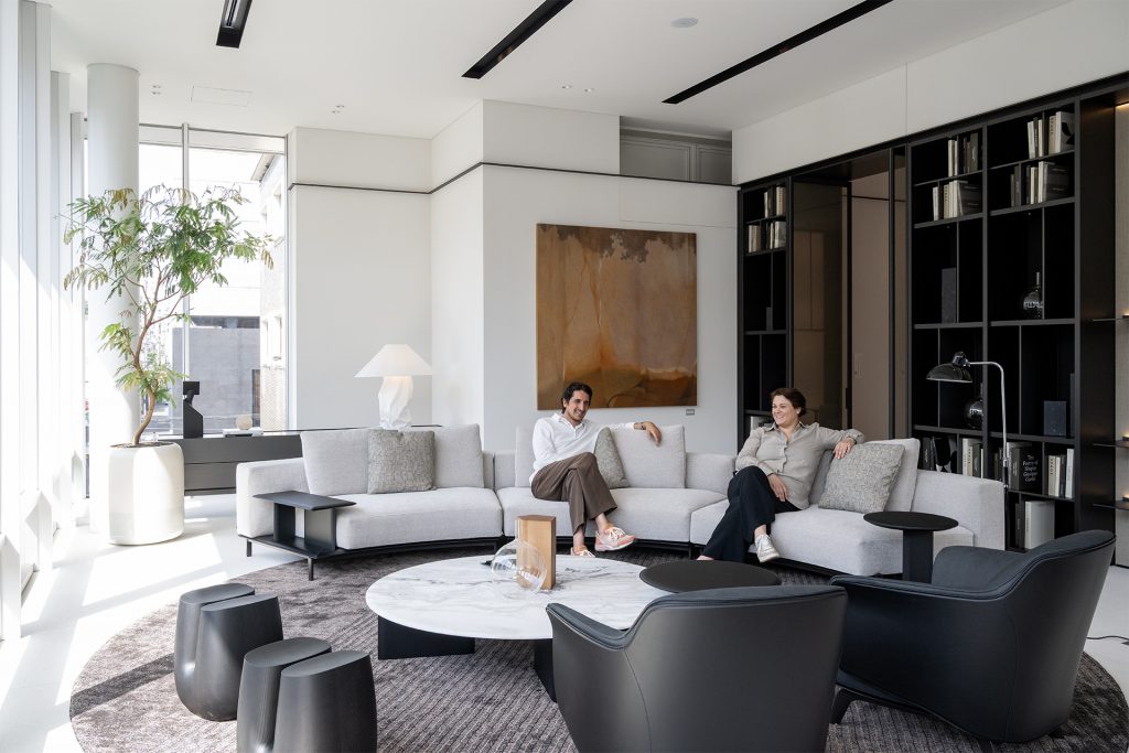 ポリフォームのはじまりは1942年。ソファでくつろぐのはオープンを機に来日したガイアとマルコ、創業ファミリー・スピネリ家の従兄弟同士です。社名の由来を「ポリは複数の、フォームは形の意味。私たちのデザインは幾何学的な形が多い。いくつもの形を重ねて、自分の暮らしをつくってほしいと先代が名付けました」と話します。