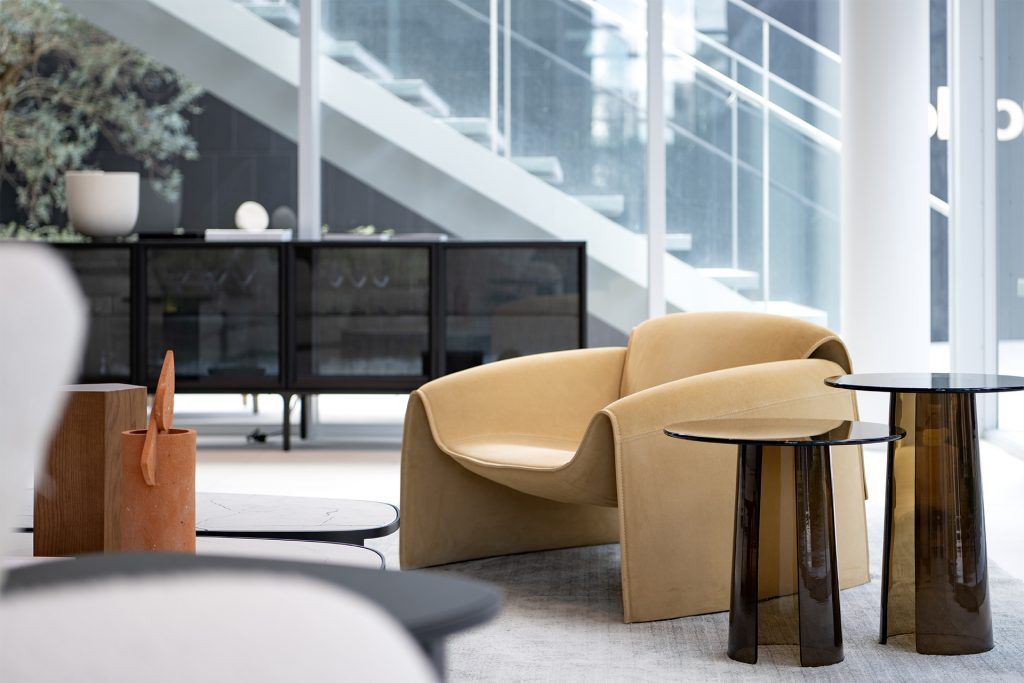 さらに依頼主がカスタマイズしたオリジナルの空間に、デザイン家具をアクセントピースとして選ぶのがポリフォームスタイル。80年代テイストのソファ「アーネスト」や曲線的なアームチェア「ル・クラブ」はジャン・マリー・マッソーによるアイコニックなアイテム。こういった「記憶に残るピース」も持ち合わせています。