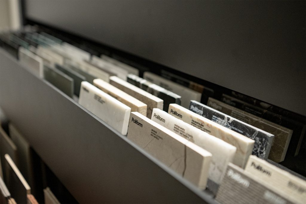 2階の奥には多数のマテリアルサンプルをそろえたコンサルティングルームがあり、最後はここで自分たちの印象を整理できます。ファクトリー直結の「カスタマイズ」をどう使いこなすか、具体的に考えられる知的なショールームなのです。
