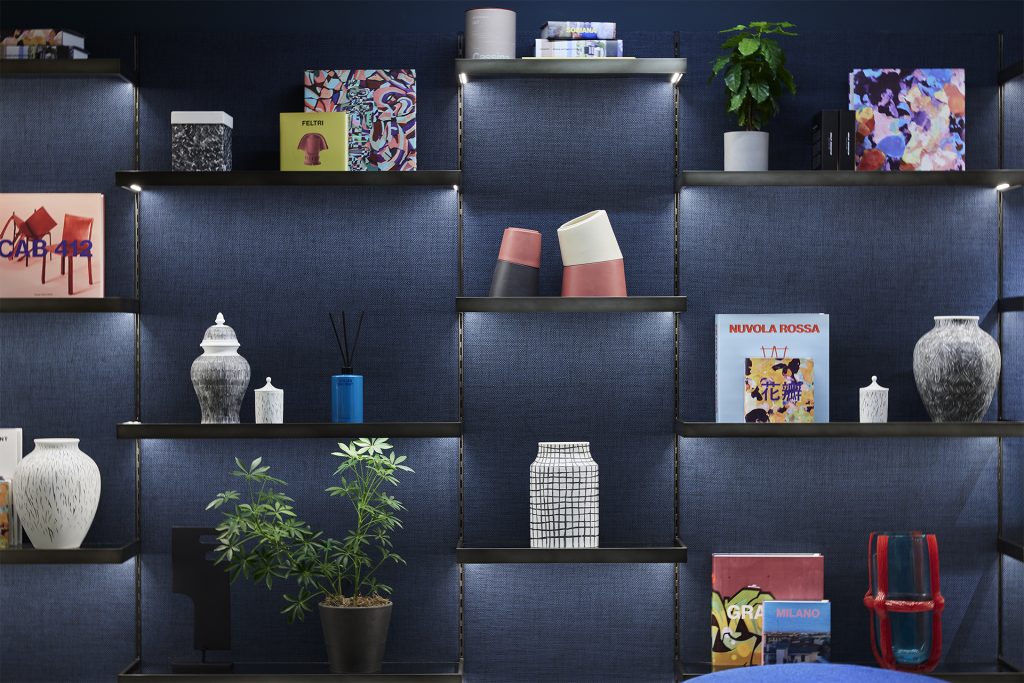 ヴィヴィッドカラーの壁やアートが家具の個性を際立たせる「掛け算」の魔術。カッシーナのオリジナル小物(アクセサリー)も充実し、造形的な花器やジノリの器など、壁面の展示はまるでアートのよう。カッシーナの家具と合わせると実にぴったりきます。所々に飾られたアートのインパクトにも注目です。