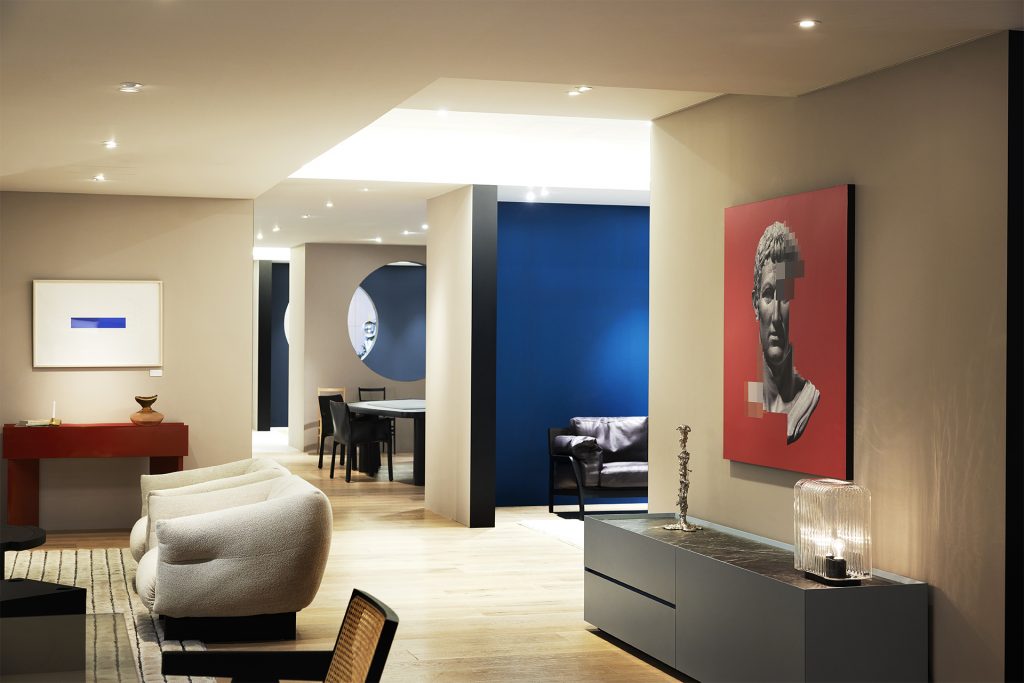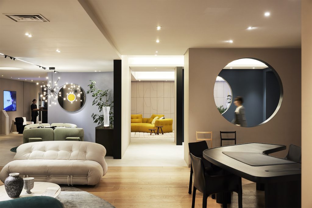 まるでここは色のラビリンス。円窓の壁が重なり合って、壁の色や家具、歩く人が幻想的にさえ見えます。外苑前のカッシーナ・イクスシー青山本店2階のカッシーナフロアは、アートディレクターのバトリシア・ウルキオラにより、ミラノのフラッグシップショールームと温度差のない空間に生まれ変わっています。
