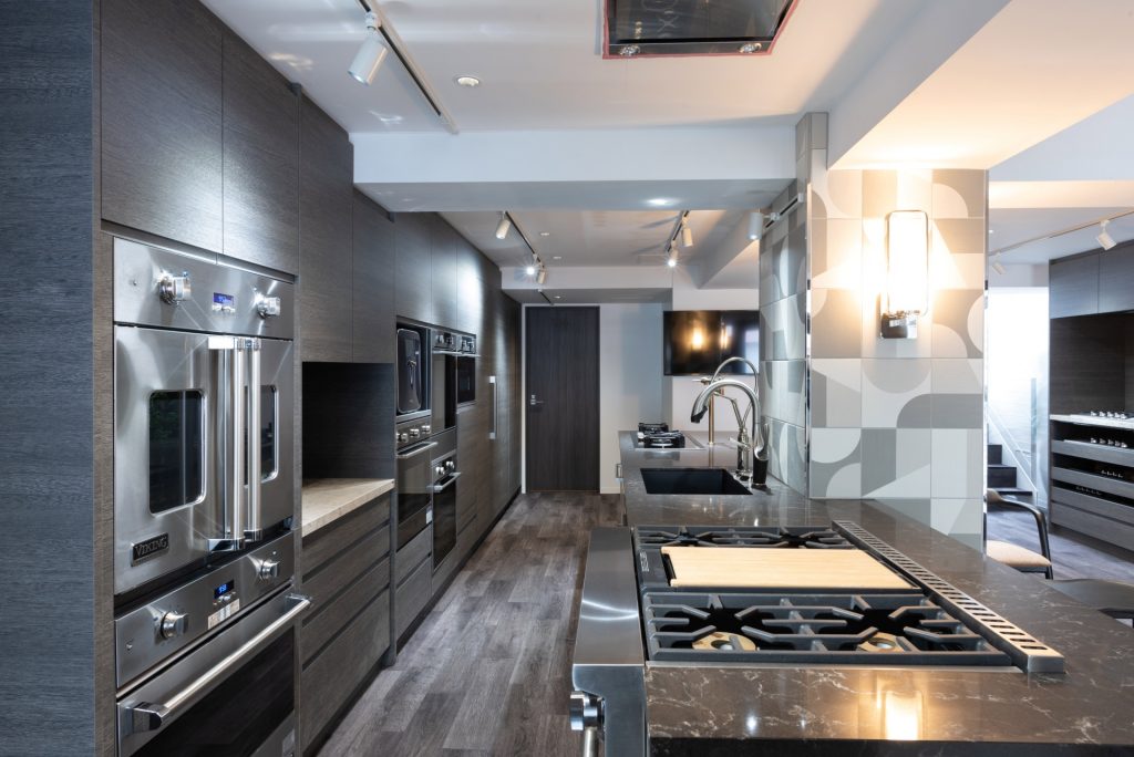 リニューアルした2階を先に紹介してしまいましたが、1階のエントランスを入ると、多様な調理機器を搭載したデモンストレーションキッチンがお出迎え。アメリカの家によくある、広いキッチンルームにいるような気分になります。