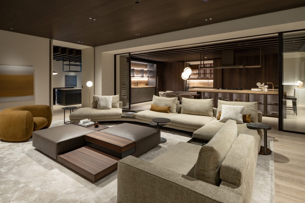 地上3階地下1階の面積は約1000㎡。各フロアでリビング、メインダイニング、オープンキッチン+ダイニング、ナイトエリアのパターンを組み、間取りが同じ要素でも素材や家具の組み合わせ、カラートーンが違うとこう変わるという変化を体験できます。