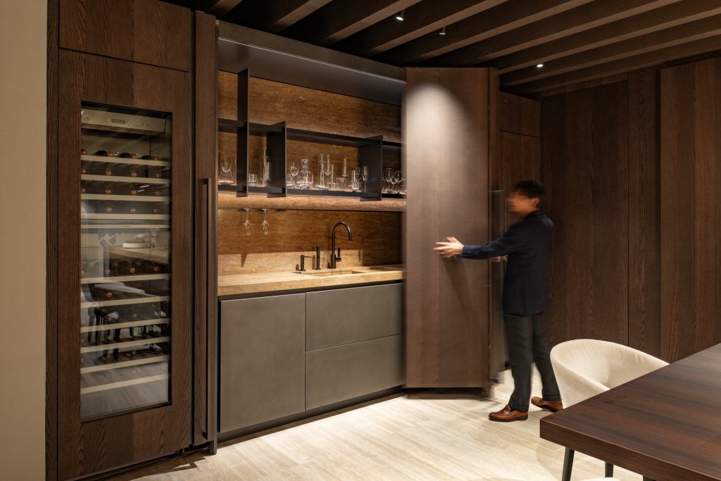 「Hidden Bar」はキッチン「ティヴァリ2.0」のオリジナル折戸で隠せるバーキッチンを実現。