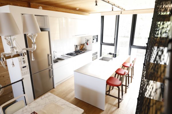 プランニングはほぼオンラインで進められたというシンプルな白いキッチン。建築に合わせた素材の仕立てやサイズを指定できるのもキッチ…