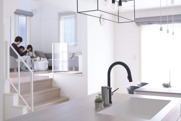リビングからキッチンをみおろす。キッチンからはリビングが自然に目に入る。スキップフロアを生かしたキッチンプランでは家族の視線が…
