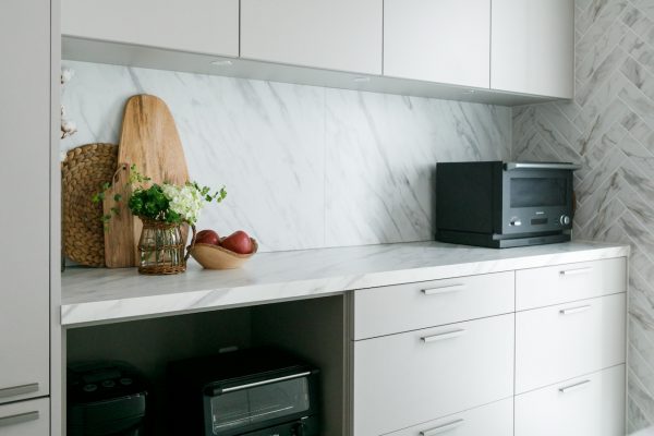 ホワイトマーブルの品のある紋様が印象的なキッチン。元気な子どもたちを育てる多忙な日々の中で、彼女が自分らしさを表現できる場所が…