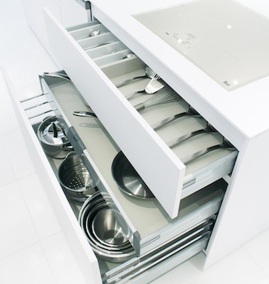 キッチンの収納はいま引き出し式が主流ですよ。 昔はパカンって開く、観音扉が多かったですね。 でも引き出し式なら、こんな風に…
