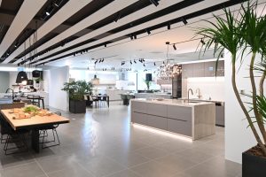 ダーダのキッチンデザインの最大の特徴はリネアコンポジション(線構成)と呼ばれる、縦横に流れるラインを描くキッチンプランです。「トリム」というモデルは、壁の収納の一部がガラス戸になっていて、LED照明が内側をほのかに照らし、中のものがかすかに見えます。見えないところで技術的な工夫を凝らしています。
