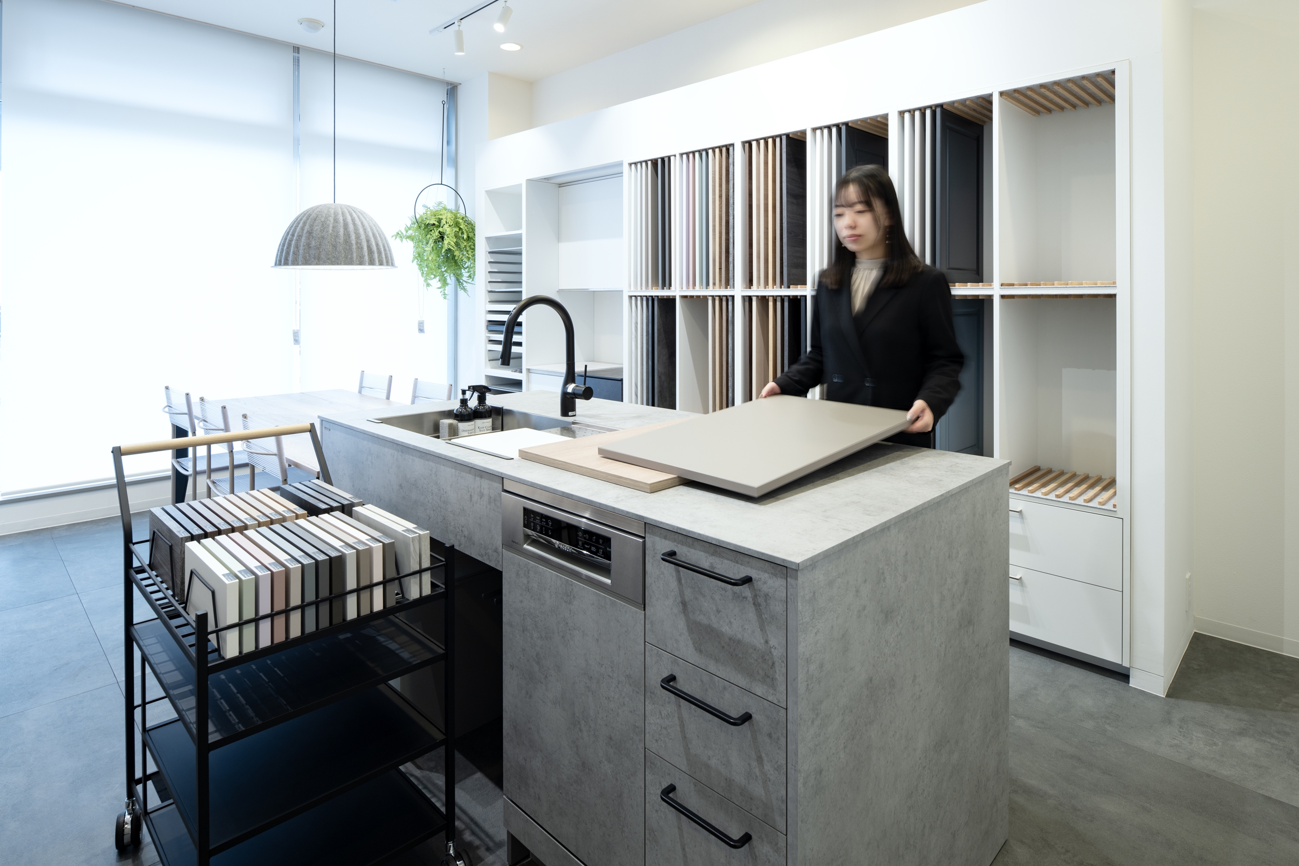 扉材はもちろん同社のオリジナル素材の「エバルト」。熱や汚れに強い素材で木目やミネラル調、マットカラーなど精細な印刷技術で表現されたテクスチュアを自然光の入るスペースで選ぶことができます。インテリアキッチンとして機能以上に、この色選びを楽しむ人が多いそうです。