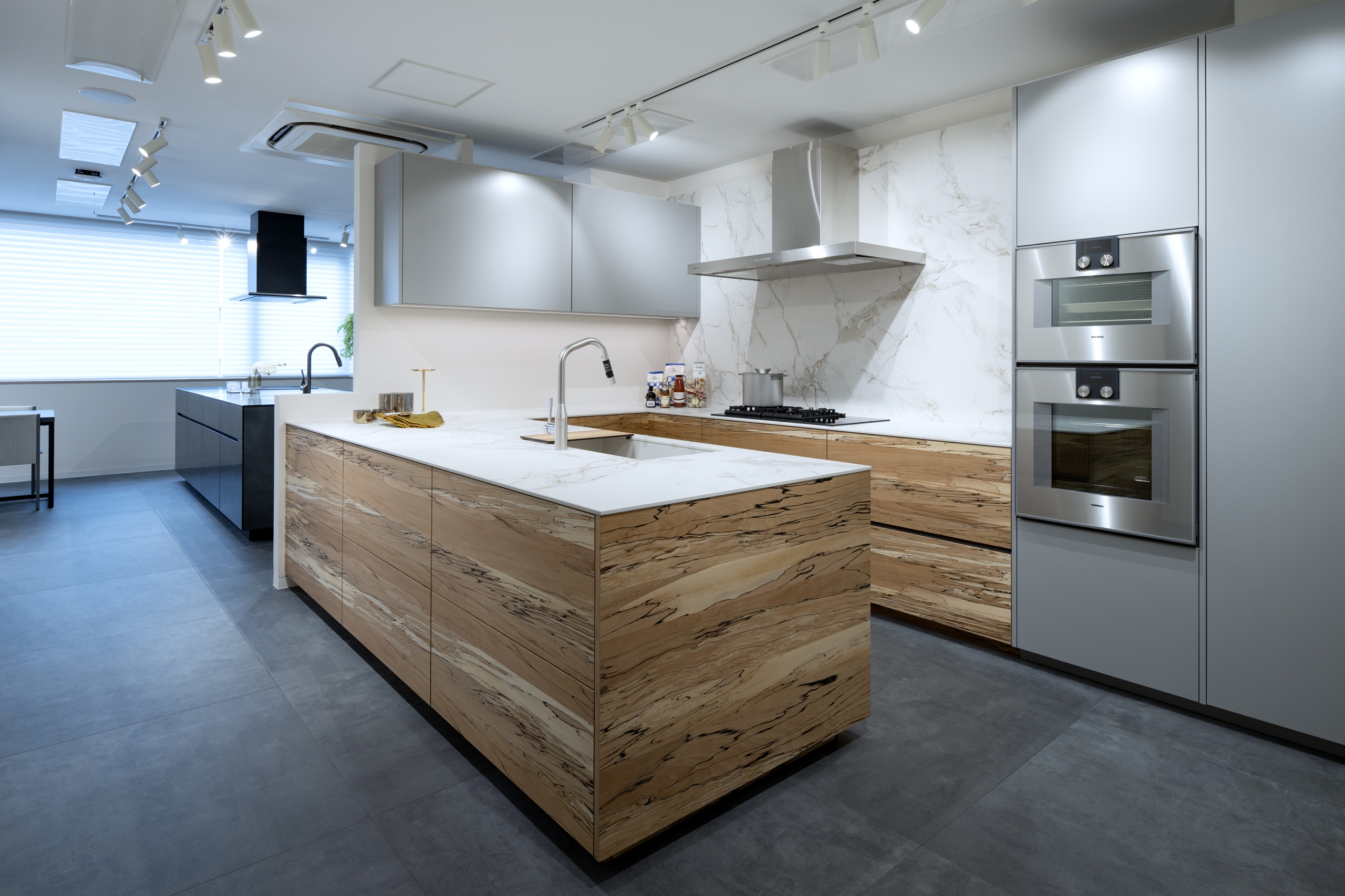 1階を出てエレベーターで案内されるオーダーメイドゾーンは、ベーシックモデルでは物足りない、というインテリアキッチン上級者のための特別ゾーン。素材もビルトイン機器も上級クラスのものでプランしたリッチなキッチンを展示しています。