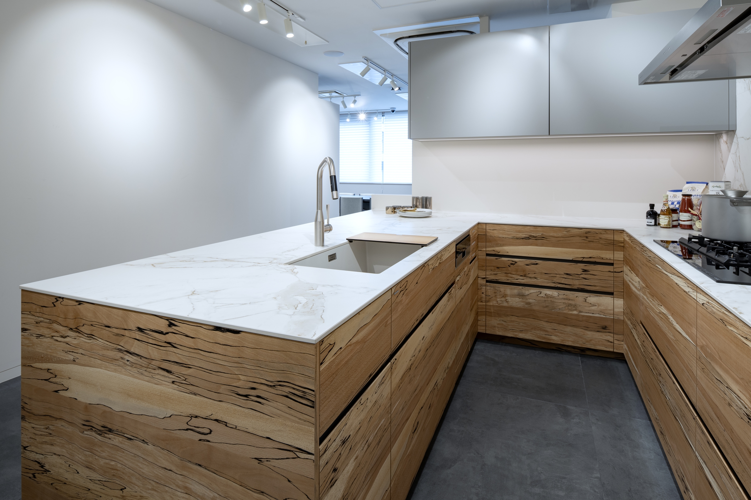 まずはキッチンハウスの扉材のシンボリックな素材の一つ「トリュフビーチ」と、ゴールドの紋様が走るデクトン「エンツォ」をワークトップに使ったキッチンが、ゲストを迎えます。