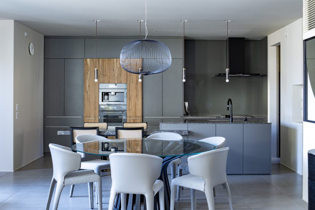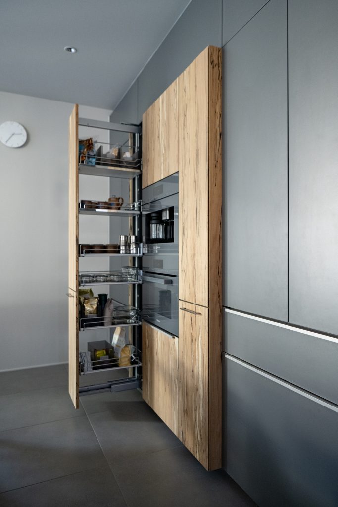 アートが好きな奈穂子さんがキッチンデザインで一番気に入っているというのが、トリュフビーチの扉材です。「この扉材を見てキッチンハウスに決めたくらい気に入りました」と奈穂子さん。グレーのキッチンに温かみとモダンさを添えています。
