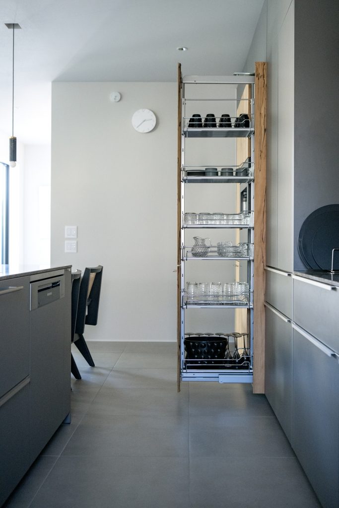 そしてこの部分が収納でも最も使いやすいトールキャビネットになっています。透明感あるガラスの食器をいれた棚は、開け閉めするたびに光を綺麗に感じます。