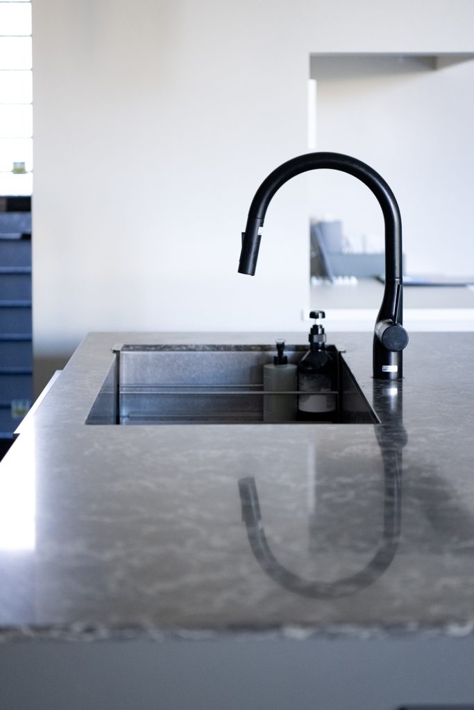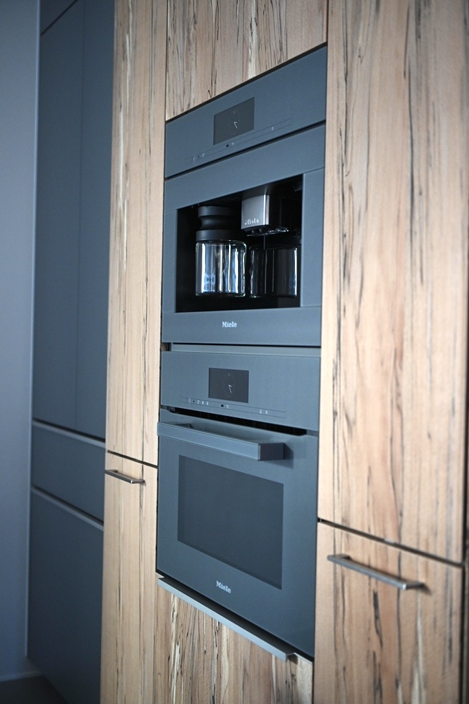 シンクもすっきりとスクエア型で、黒の水栓は先が引き出せるシャワーヘッドが付いていますが、スリムでカーヴィーなフォルム。これは絶対にほしかったというミーレのコーヒーマシンと電子レンジ付きオーブンが、奈穂子さんの食事の支度を助けています。