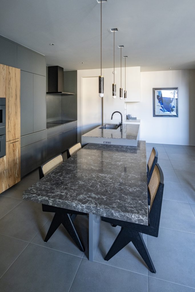 テーブルトップの部分にはシーザーストーンの「コースタルグレイ」を選び、重厚感を出しています。テーブルトップはキッチン部でしっかりと合体させ、さらに足の部分は一枚のパネルですっきりと支えています。そこに名建築家のジャン・ヌレのチェアを採用し、リビングとは違うエレガントなダイニングとしています。もちろん食卓から伸びる視線の先にもアートが。