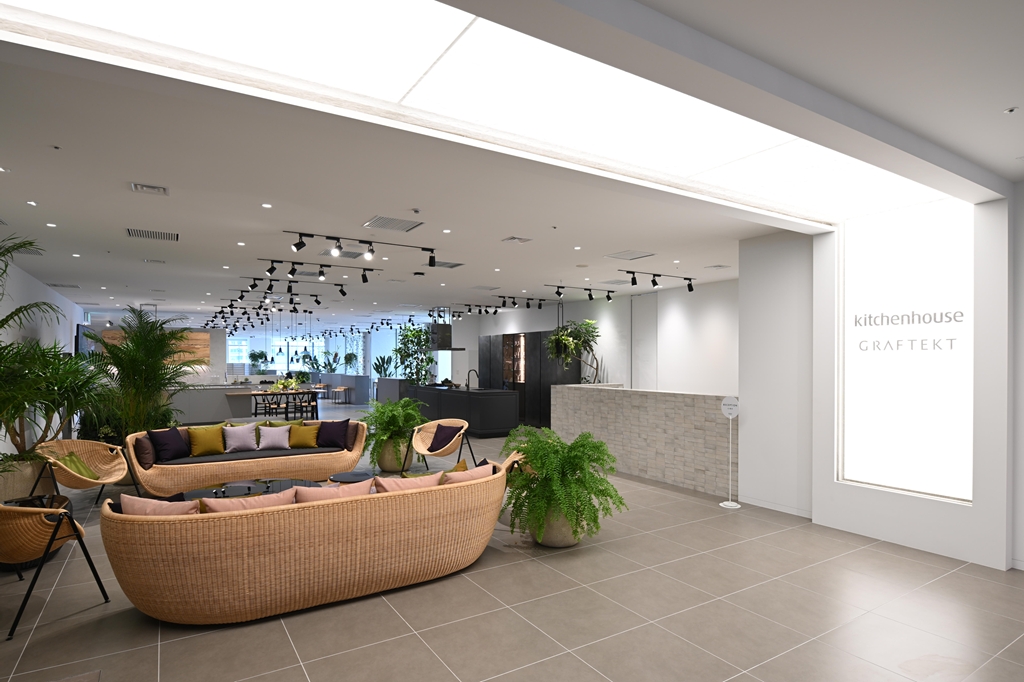 エントランスではリゾートホテルのような籐編みのリラックスソファで待ち合わせすることもできます。キッチンハウスのショールームでは、世界から買い付けてきたブランド家具や小物でコーディネートされ、そのセンスの良さも魅力です。