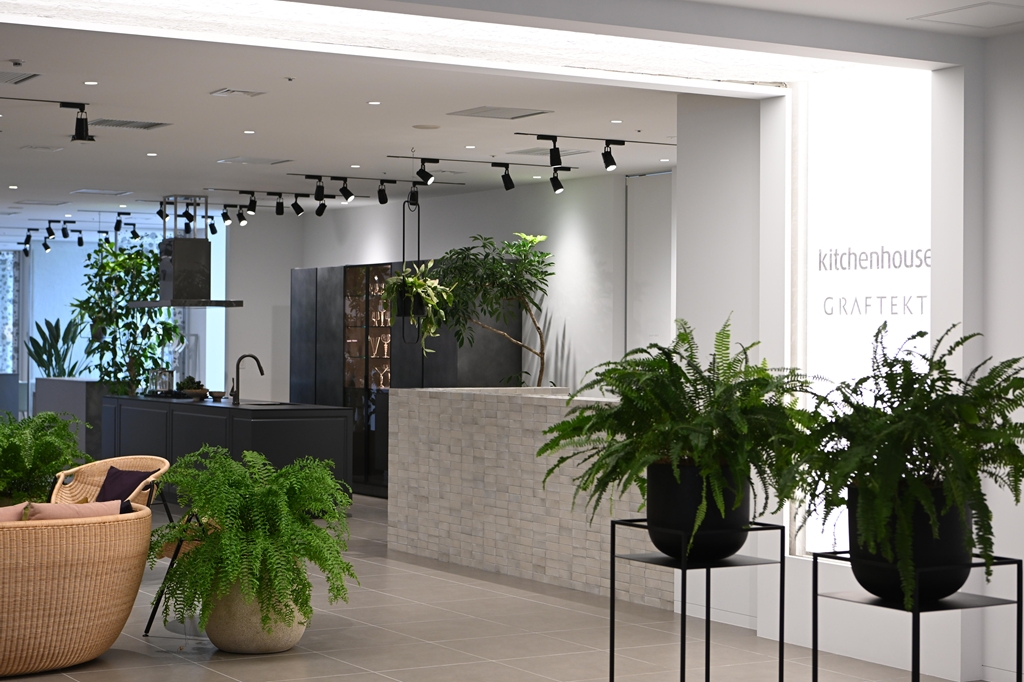 キッチンハウスの大阪ショールームが拡大、展示をより充実させてリニューアルオープンしました。コの字型の1000㎡のスペースに、キッチン20セットが並ぶワンフロア空間。グランフロントの中でもオフィス棟の15階にあるため、入る時はちょっと緊張しますが、周囲の高層階ビルを眺めながらキッチンを選べる、浮遊感のあるショールームです。まずたっぷりの緑がゲストをお迎えします。