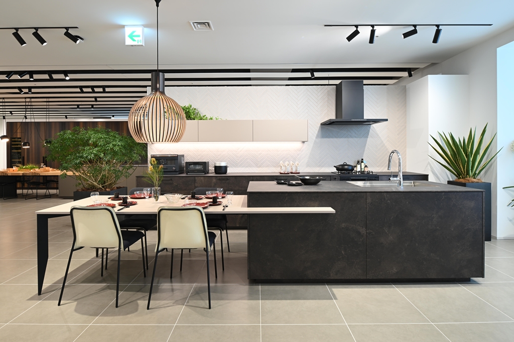 ブラックや濃いグレーのキッチンはキッチンハウスが広めたともいえるトレンドカラーの一つ。人気のアッシュベージュのテーブルや扉を合わせるだけで、重厚感を和らげてくれるコーデです。こちらも人気カラーのメルクリオのデュエストレート型。