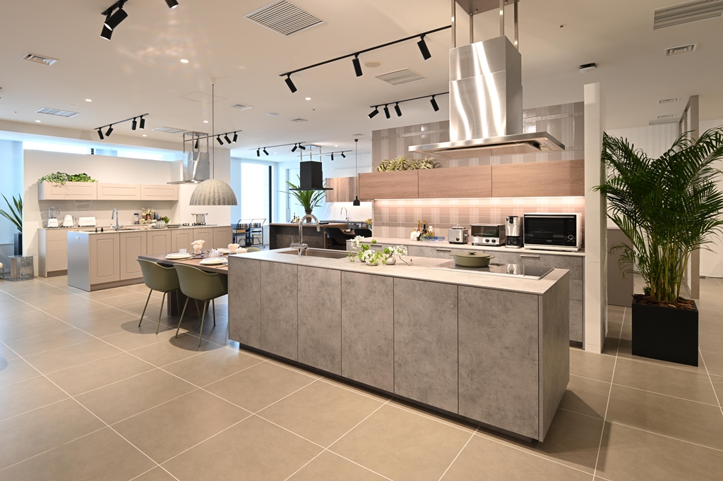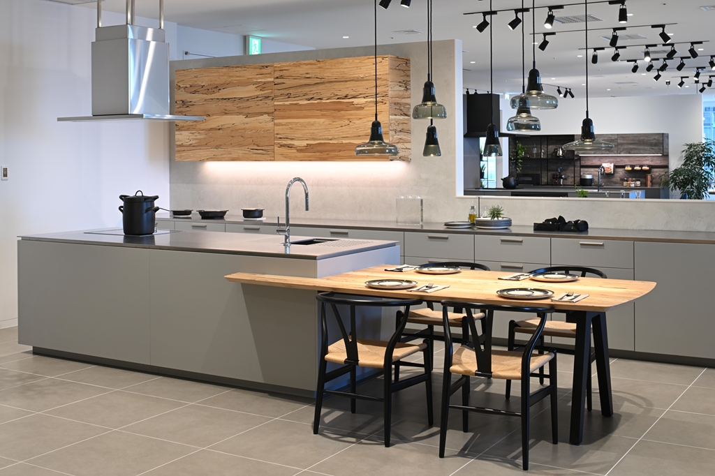 ショールームの大半を占めるのが、多くの人に人気のあるベストセラーや新作です。キッチンハウスでは、レイアウトにも「デュエ」や「ポポラート」などの定型があり、キッチンプランに悩む人も選びやすくなっています。こちらは淡いグレーがにじむカラー、ピアノベトンのアイランドストレート型。