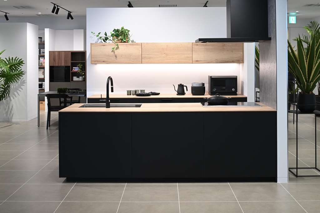 こちらはよりシンプルにまとめたタイプ。ミニマリスティックなキッチンデザインが好きな方におすすめの新色のブラックです。吊り戸棚とワークトップをノッティナチュラルにして、柔らかさを出しています。