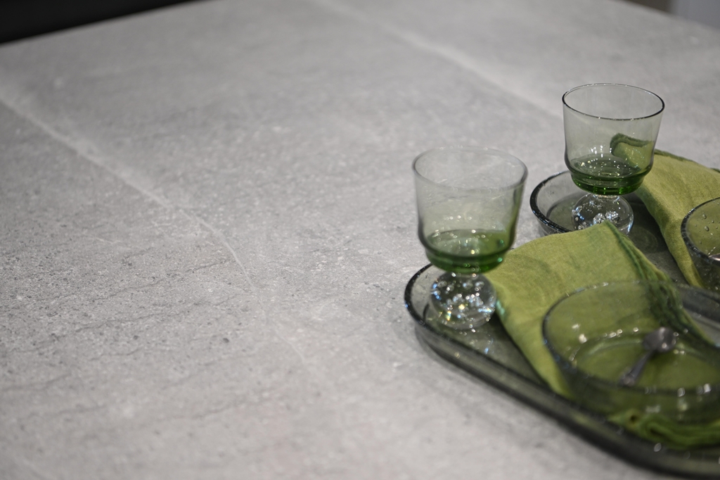 ワークトップの素材もキッチンハウスオリジナルの「エバルト」のほか、クォーツストーンを選ぶこともできます。エバルト素材の中でも人気の天然石風バサルトワークトップも、この大阪でいち早く展示しています。
