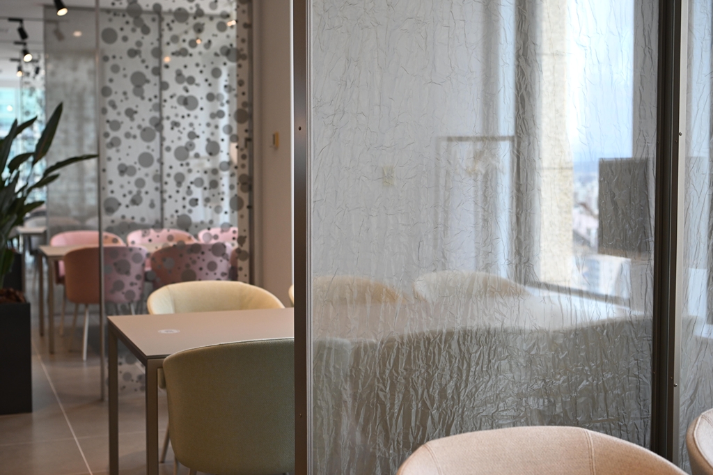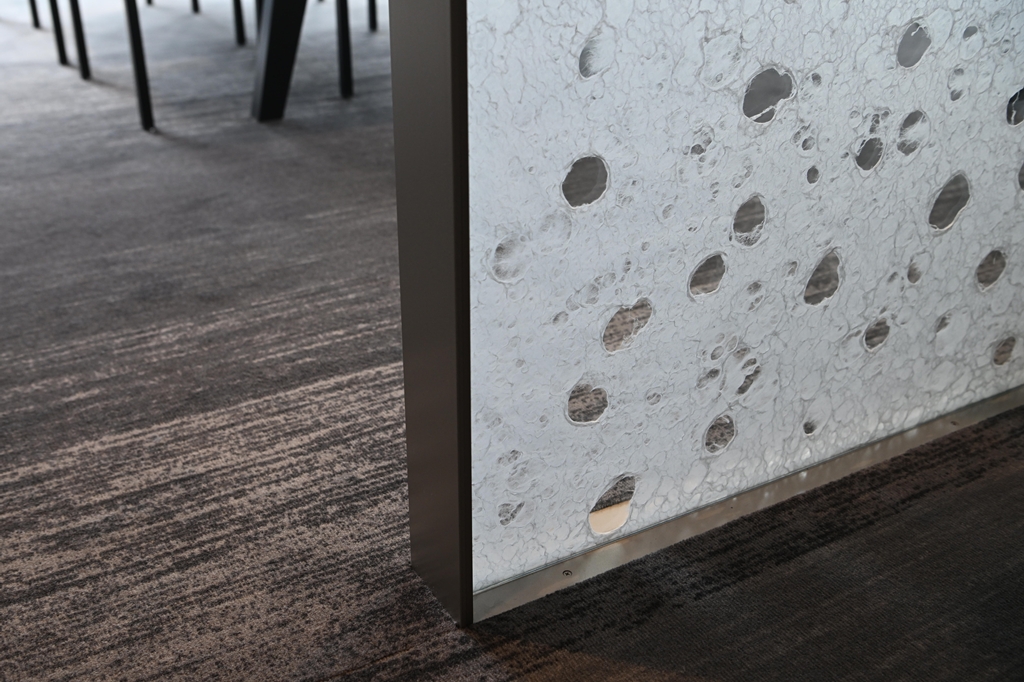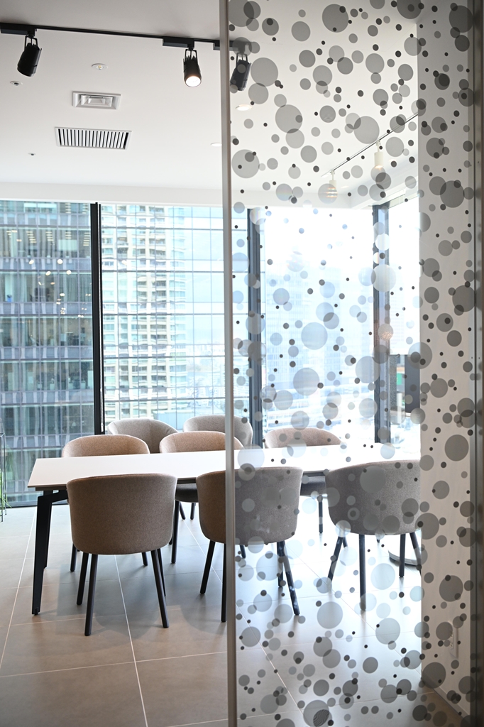 オフィスビルの中にあり、高層ビルからの眺めを得られる都会型のショールームですが、運営スタッフが意識したのが日本の素材や大阪の技術を空間に活かすこと。パーティションやエントランスにはちぎり模様の和紙や、大阪の町工場から生まれた水玉模様などのメタルメッシュがあちこちで使われています。