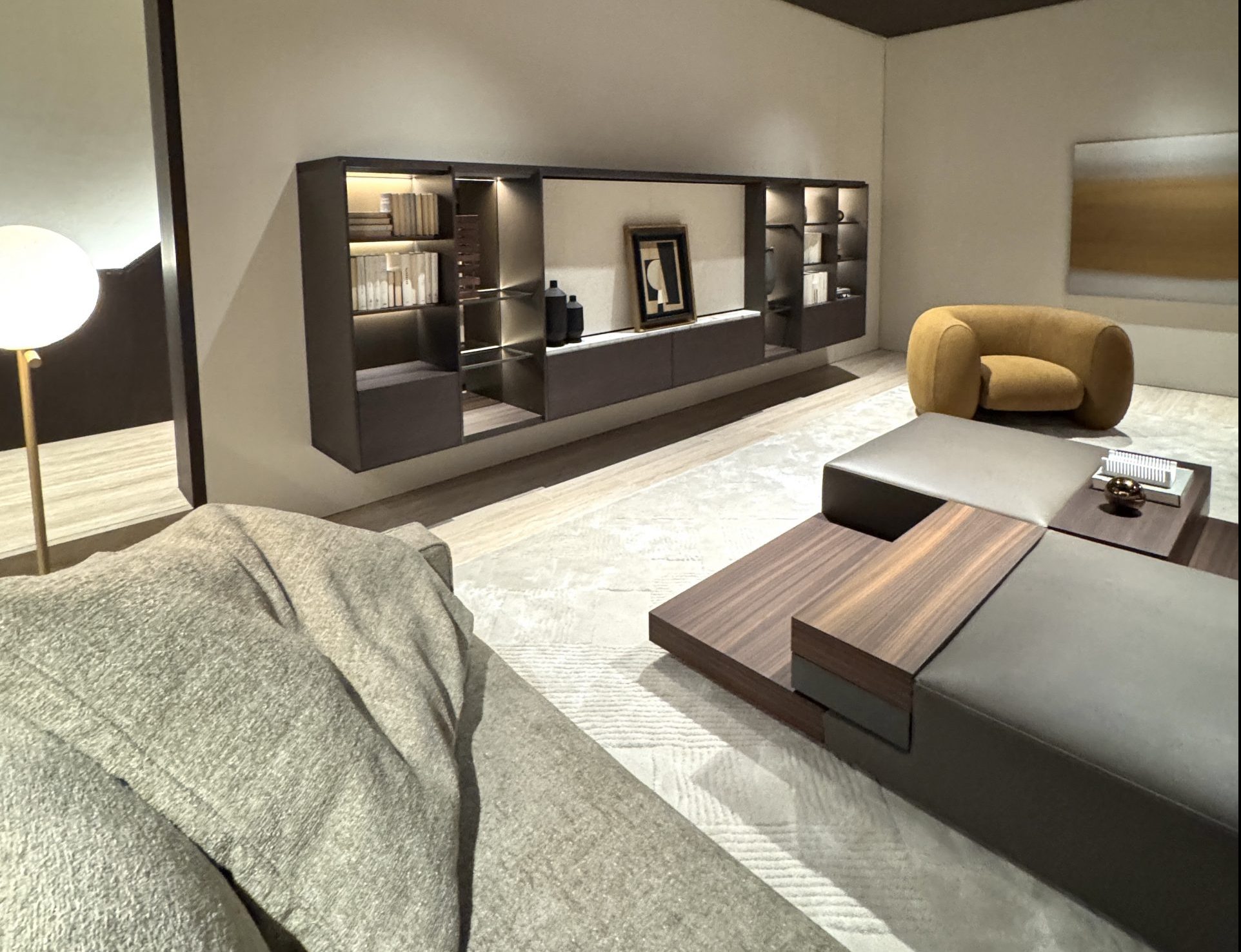 座高が低く、組み合わせがしやい「オクターヴ」はフロアライフの文化がある日本でなじみやすいソファ。ユーモラスな形のアームチェア「シナモン」はアクセント。壁面のハンギング収納は2025年に日本で発売された「ロゴス」。