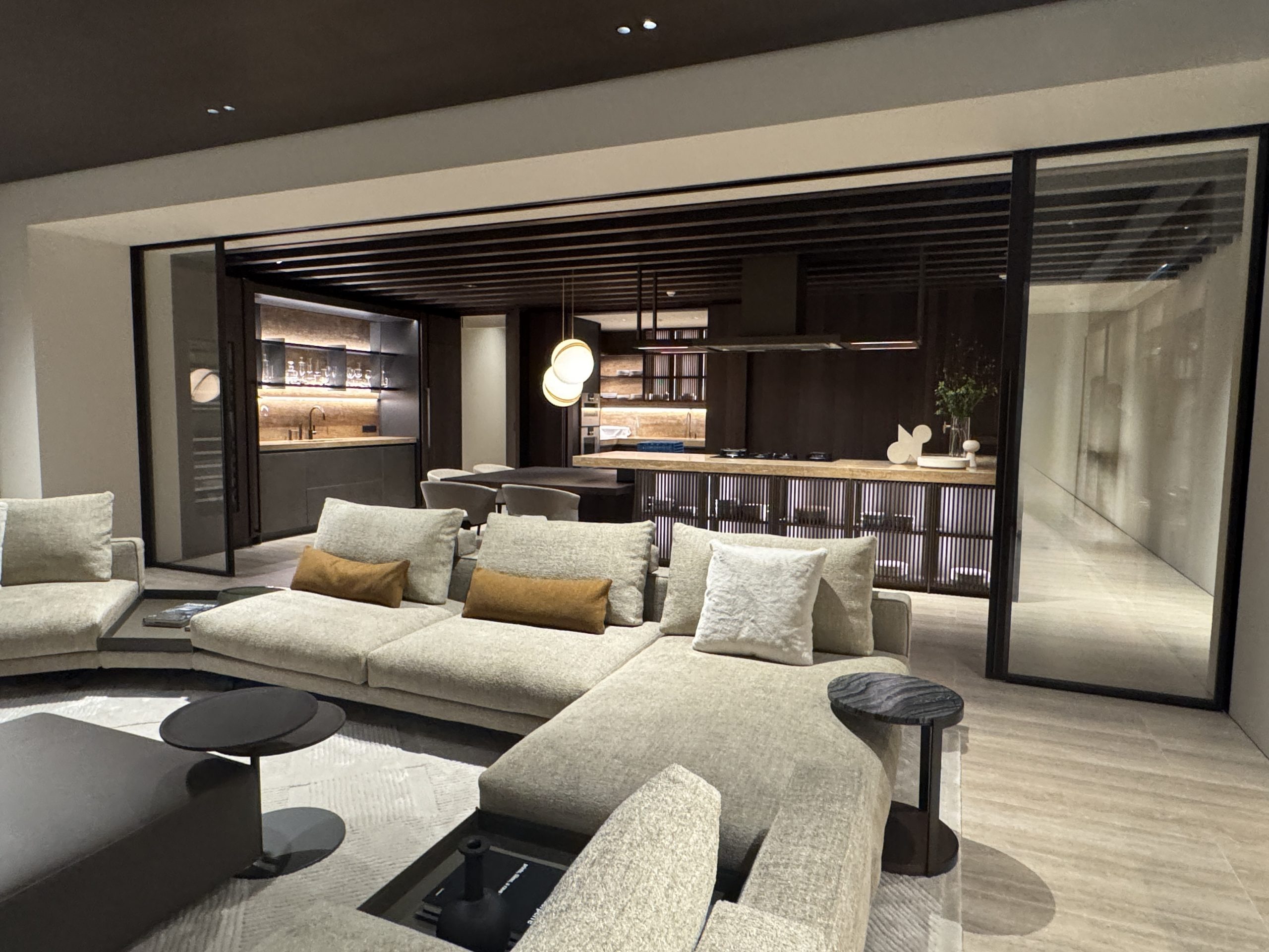 1、2階が明確にゾーニングされた場所であるのに対し、地階はエンターテイメントリビングとオープンキッチン「ラッツィオ」。透明なガラスのスライドドアで仕切れるようになっていますが、このスライディングドア「シンクロ」もモルテーニの主力製品。どのフロアでも収納やドアを使った絶妙なルーム構成に注目です。