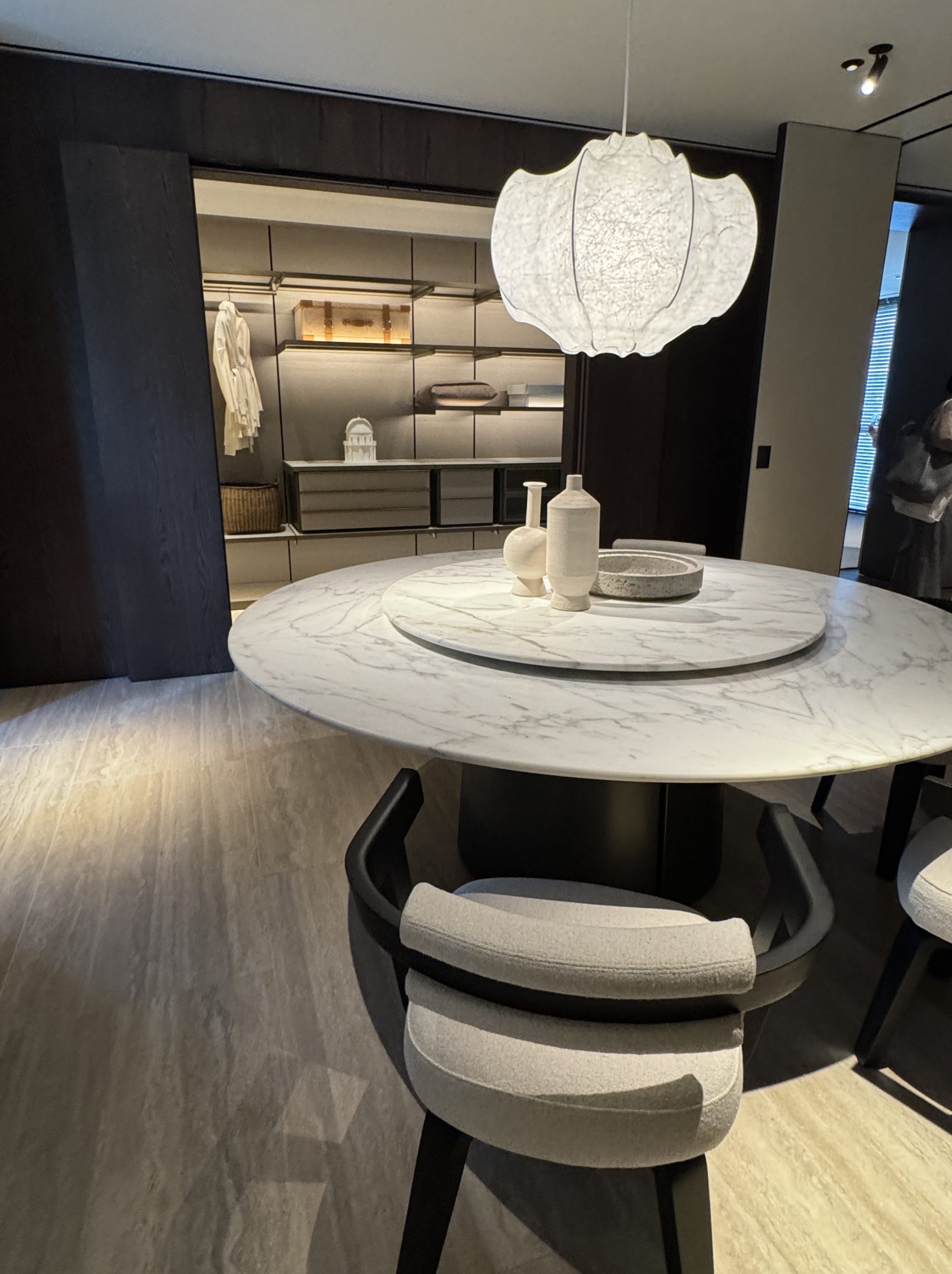 この邸宅の見どころはなんといっても、モルテーニの祖業でもある木工による収納家具の決め技の数々。天井まであるフルハイト扉をあけると、まるで壁の一部のように見えていた場所が、見せる収納としても美しい空間に変わります。上質なものを選んで生きる人の人生を受け止めるような収納です。