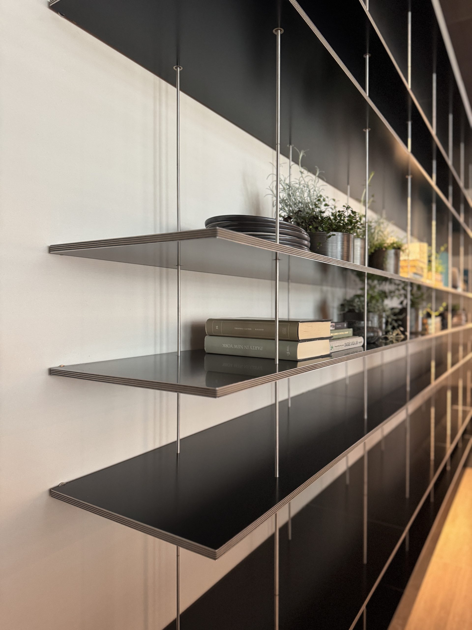 モルテーニの収納はディテールまで美しく、薄い棚板や細いワイヤーだけのミニマリスティックな構成に目を奪われます。