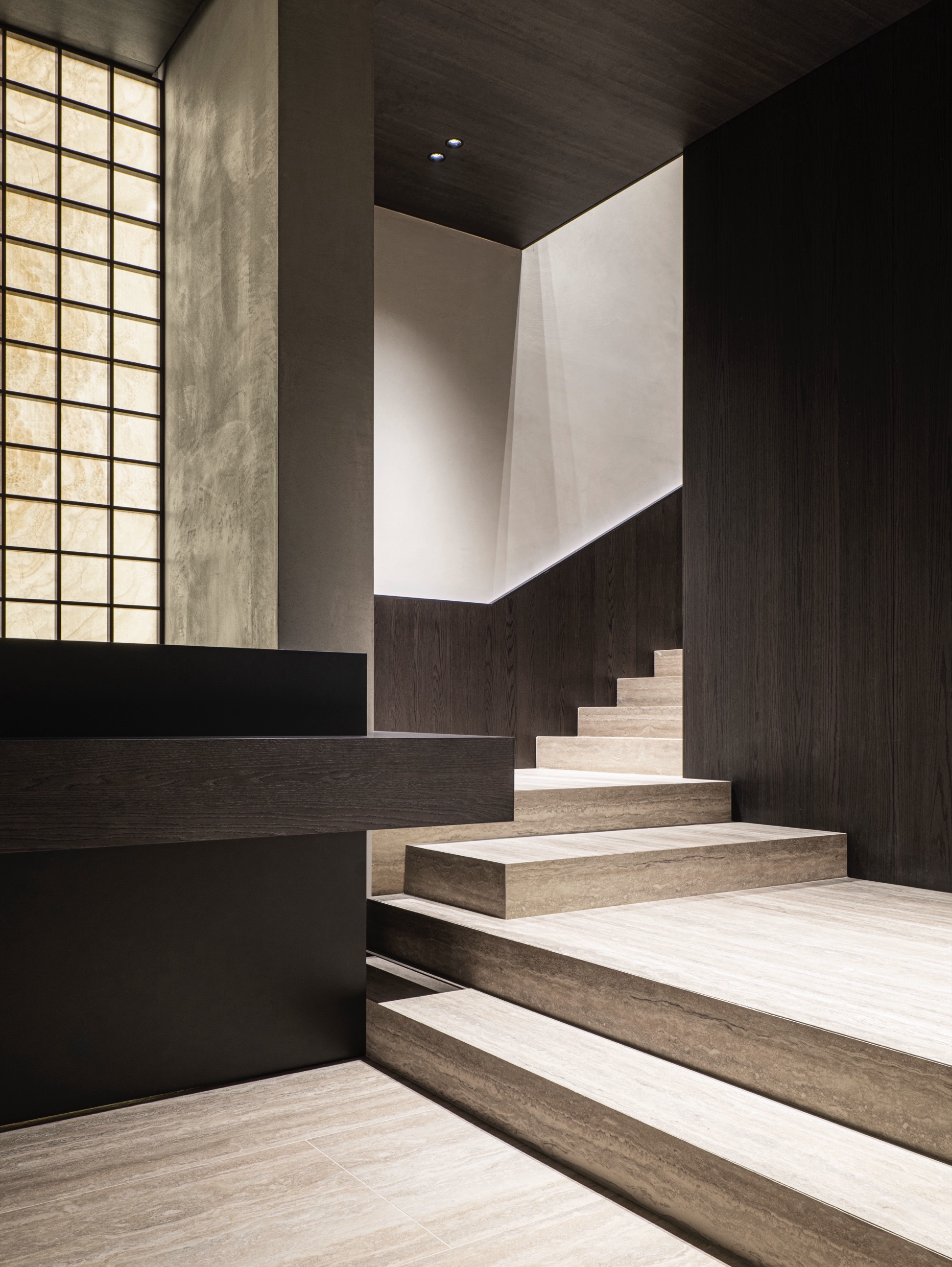 どきりとしたのは実は階段。ここは特に蹴込の角度から陰影の落ち方まで、ヴァン・ドゥイセン氏が綿密に計算したのだろうと感じます。階段を上がるたびに気持ちが一度、リセットされ、クリアな気持ちで向かうことができます。