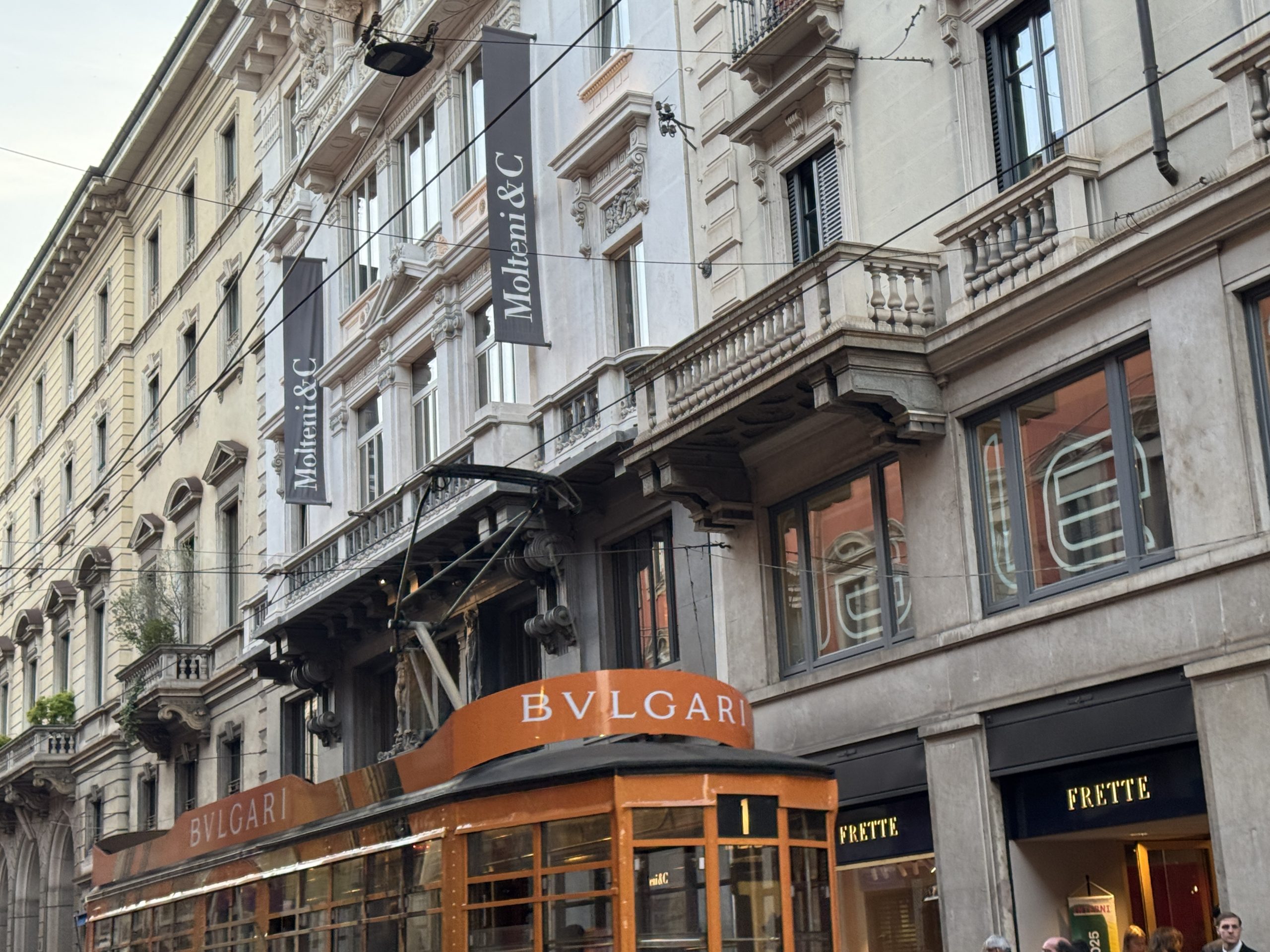 アパレルや宝飾、時計などのブランドショールームが並び、昔ながらのトラムが走るマンゾーニ通りにあります。