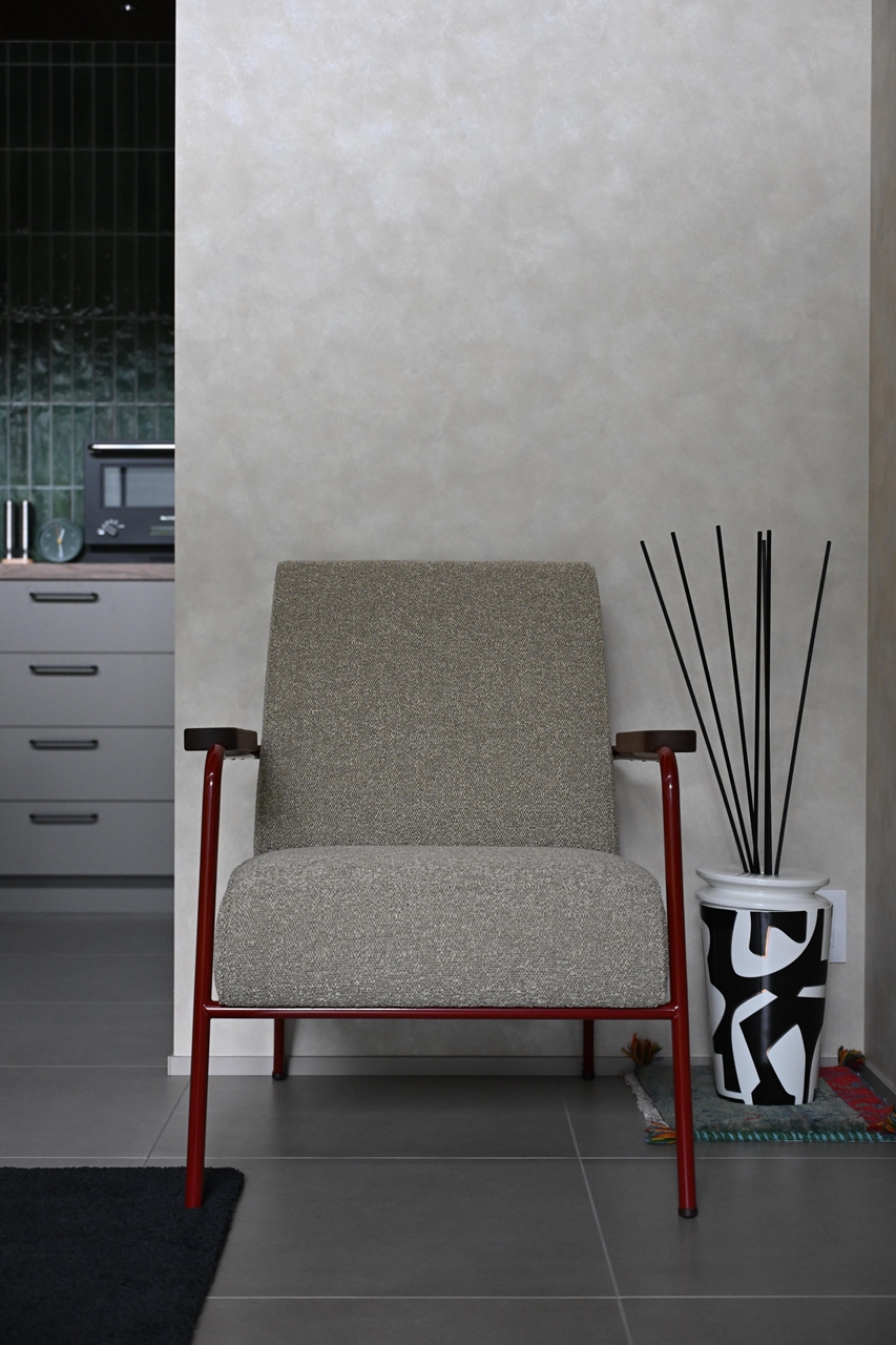 スイス・ヴィトラから復刻されたジャン・プルーヴェの椅子は壁際にアートのように置かれています。