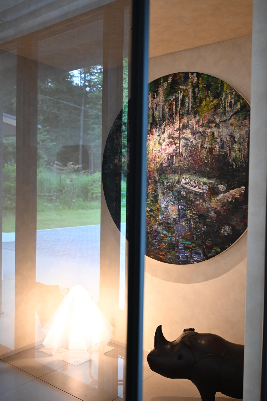 リビングキッチンとエントランスに間にはホールがあり、やはりロンドンで見つけたアニマルアートや倉俣史朗の照明、円形のアートが飾られています。作られた場所も時代も背景もそれぞれ違うものが、二人の価値観の中で一つにまとまります。