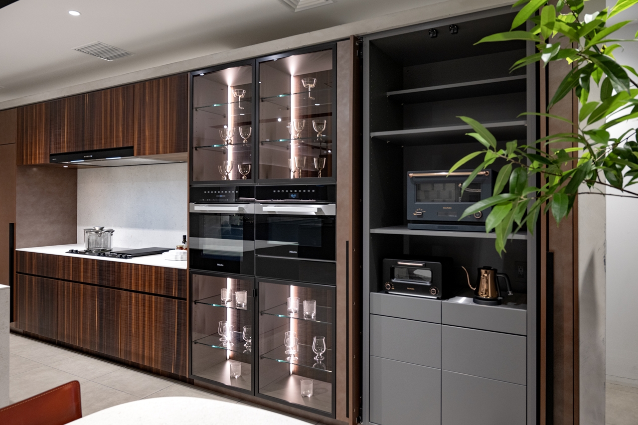 キッチンは家電収納やディスプレイキャビネット、大型冷蔵庫を備えており、高級感もしっかり演出しています。