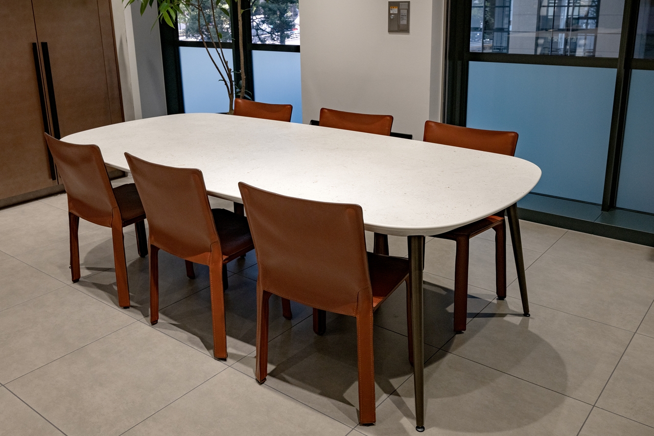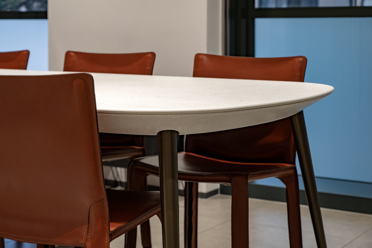 その手前にはワークトップと同素材を使った、キッチンハウスによる楕円形テーブルを展示。