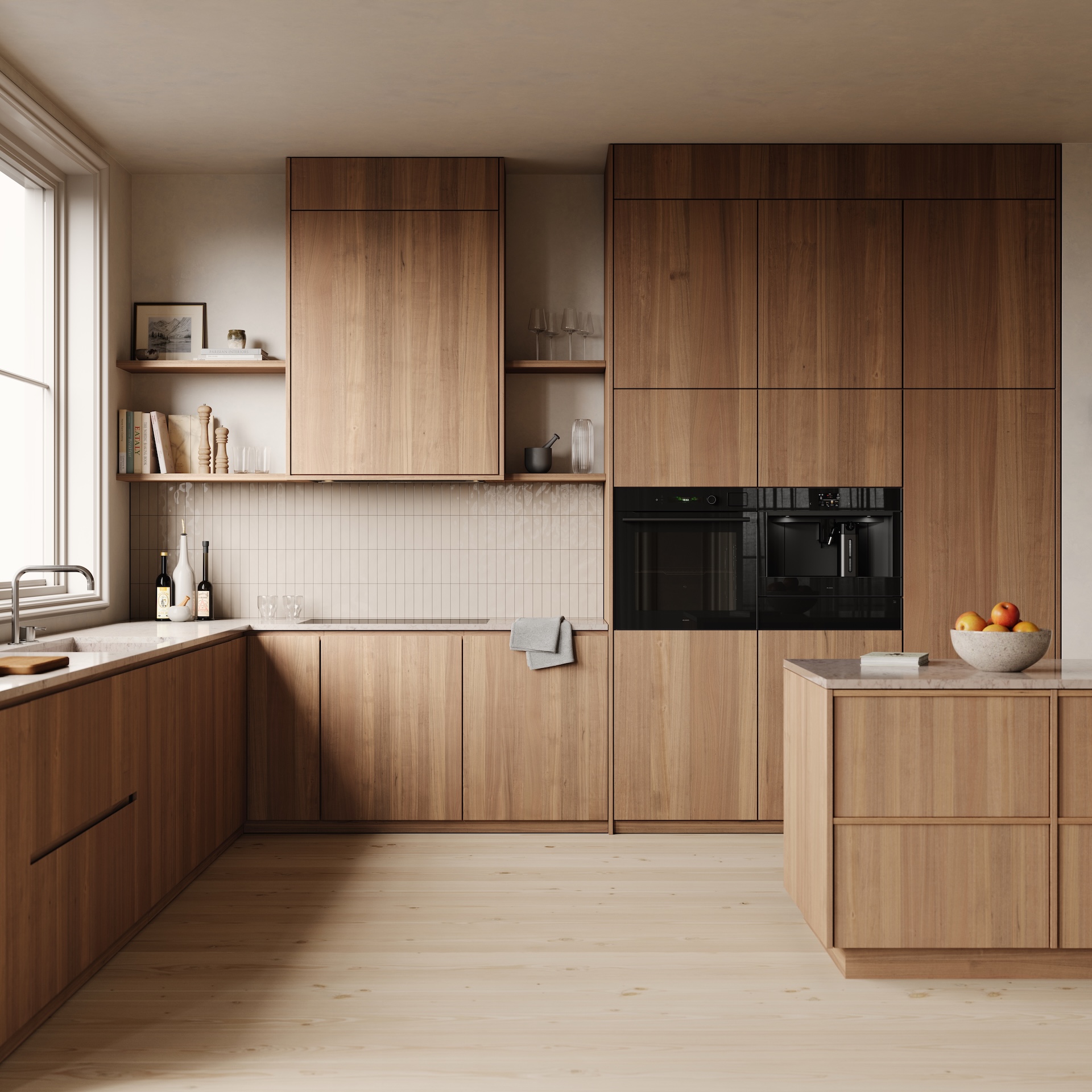 オーブンのフェイスカラーはパールブラックまたは パールグレイ のフルガラスデザイン。北欧の土地の色を思わせる色調にかすかなきらめきがあり、滑らかで彫刻的な一体型ハンドルが特徴です。