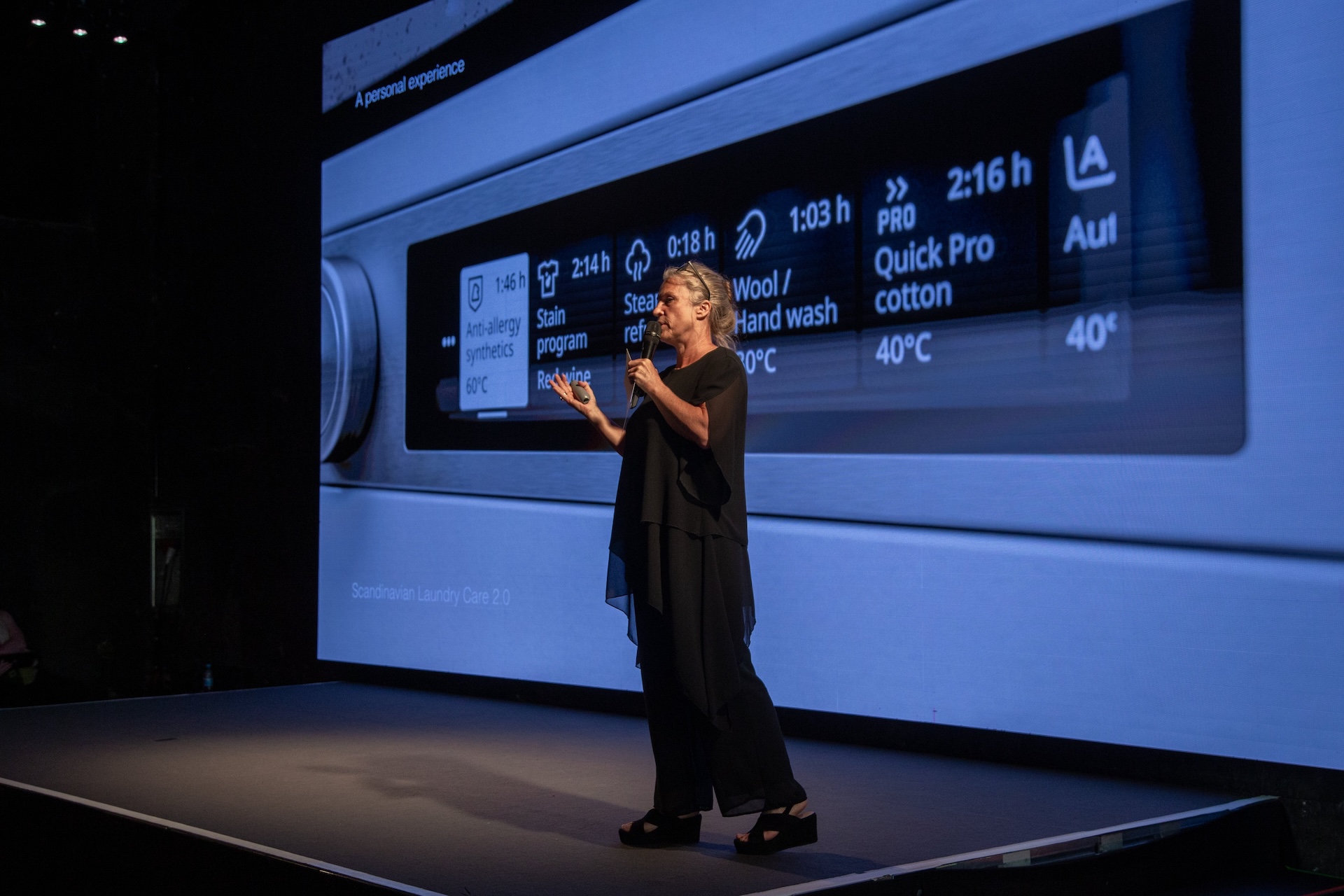 そしてランドリー。アスコで20年以上ランドリー製品の開発に従事しているというPernilla HAaageDöseさんによるプレゼンテーションです。アスコはステンレスによる頑丈な洗濯機からスタートしたブランド。その機能の基本は今なお変わらず、より強化されています。