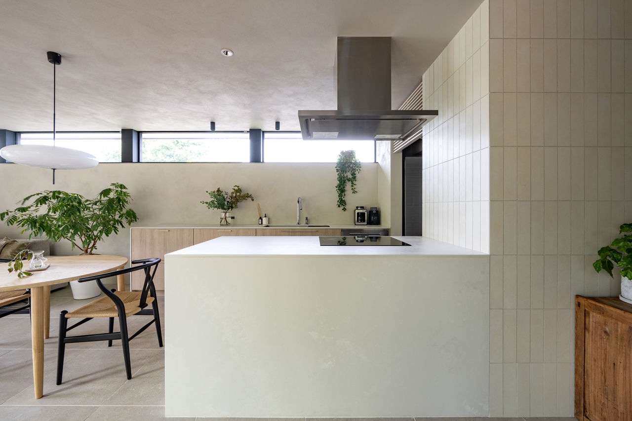 キッチンは静かにミニマルな存在感を放っています。当初はクオーツストーンだけを使ってワンマテリアルで「塊感」を表現することを考え、造作で作ることも考えましたが、キッチンハウスでもフルオーダーなら要望通りの塊感を実現できることを知ったそうです。