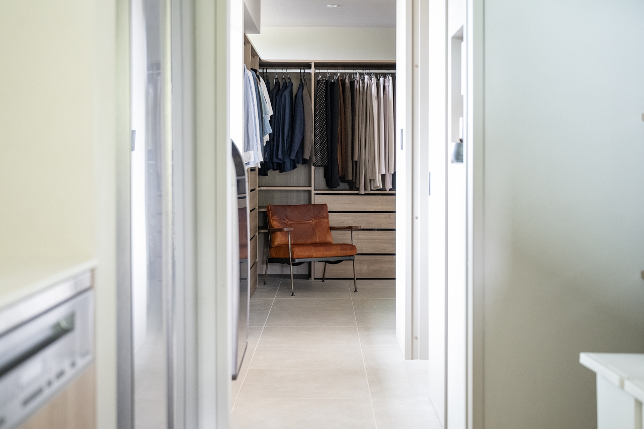 キッチンの動線は、二人が帰宅してからの流れに沿ってつくられています。玄関を入るとまずキッチンとダイニングが出迎え、その奥を抜けて手洗い・トイレ・クローゼットへと続きます。着替えを済ませ、一日の終わりを迎えた後は、再びキッチンに立ち、二人でお酒を楽しみながら軽い食事をつくるのが日常です。