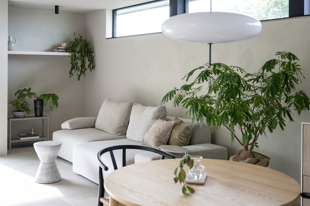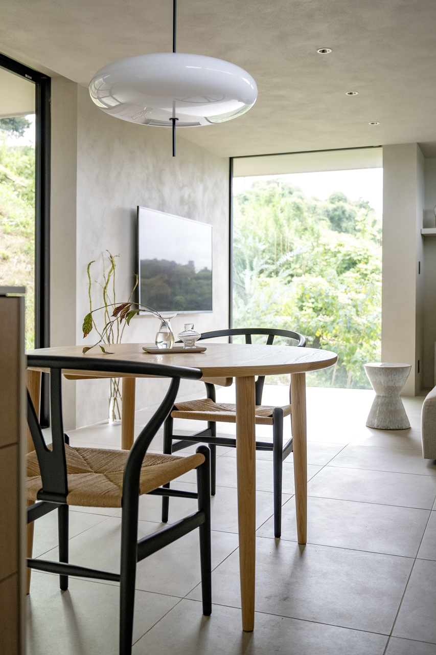 ダイニングにはカンディハウスの直径1000ミリと小ぶりなラウンドテーブル「マム」とカール・ハンセン&サンの「Yチェア」を配置。家の構成が直線的でミニマルな分、丸みのある家具を取り入れて、空間に温かみとリズムを与えています。
