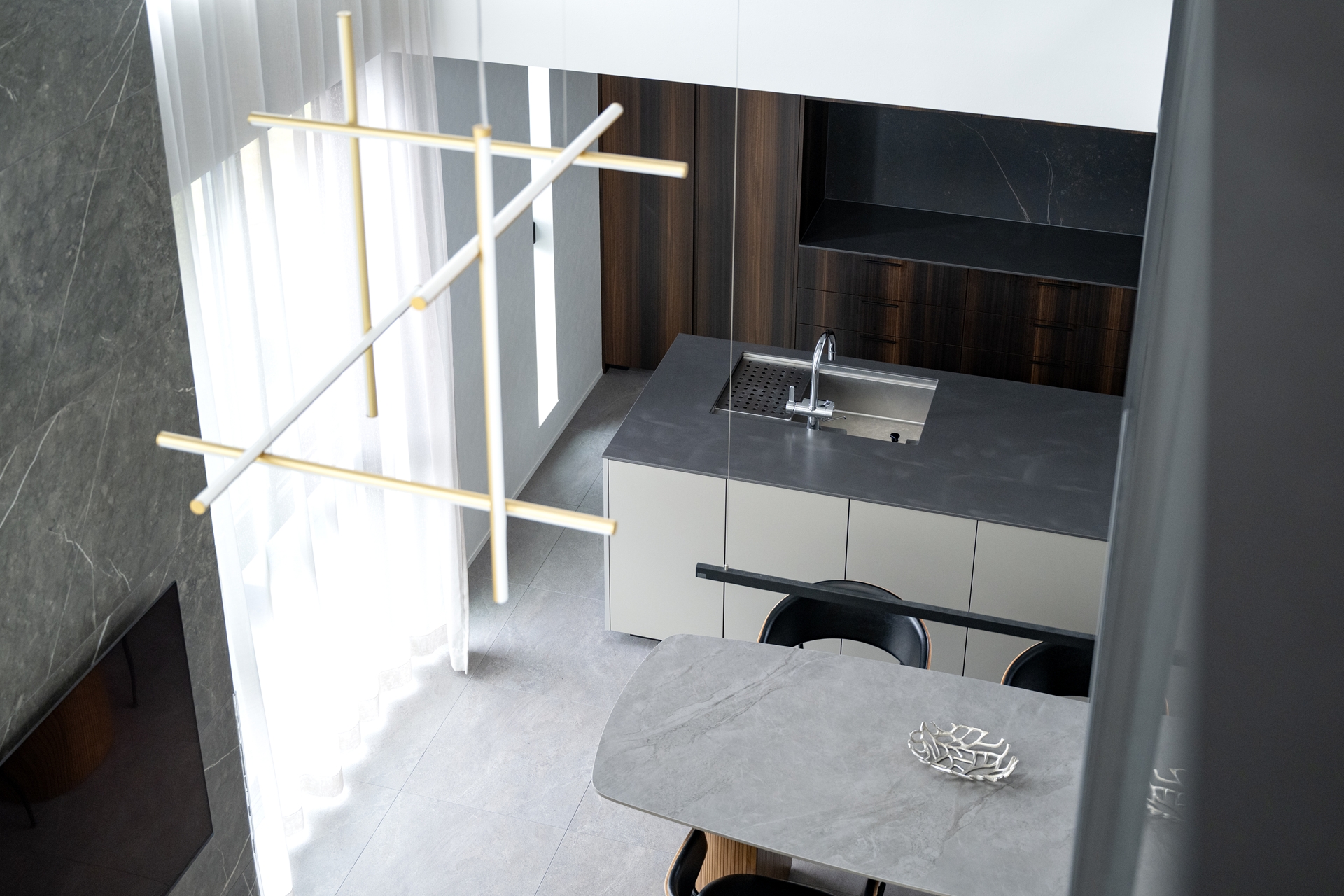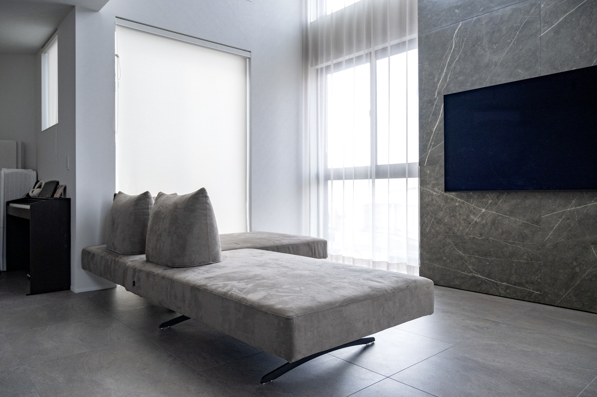 キッチンのグレー、木の色味、石の壁、家具の黒。それぞれが主張しすぎることなく、互いを引き立て合うバランスは、色彩感度の高さを感じさせます。ソファも子どもたちの好む明るい色も考えましたが、最終的には汚れも目立たず、インテリアにも合うグレーをチョイス。