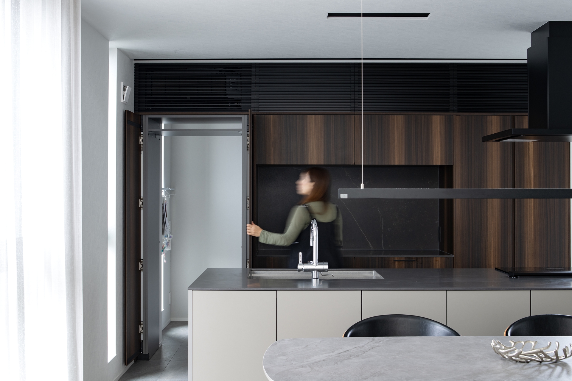 キッチンの収納、と思った部分が実はユーティリティスペースへの入り口の扉! この場合、建築構造とキッチンの扉の施工精度が重要で、キッチンハウスの担当者も施工会社と念入りにすり合わせをして実現したキッチンの隠し扉です。フルオーダーはキッチンをつくるだけではなく、建築の一部にもなれる。そんな可能性を知ることができました。