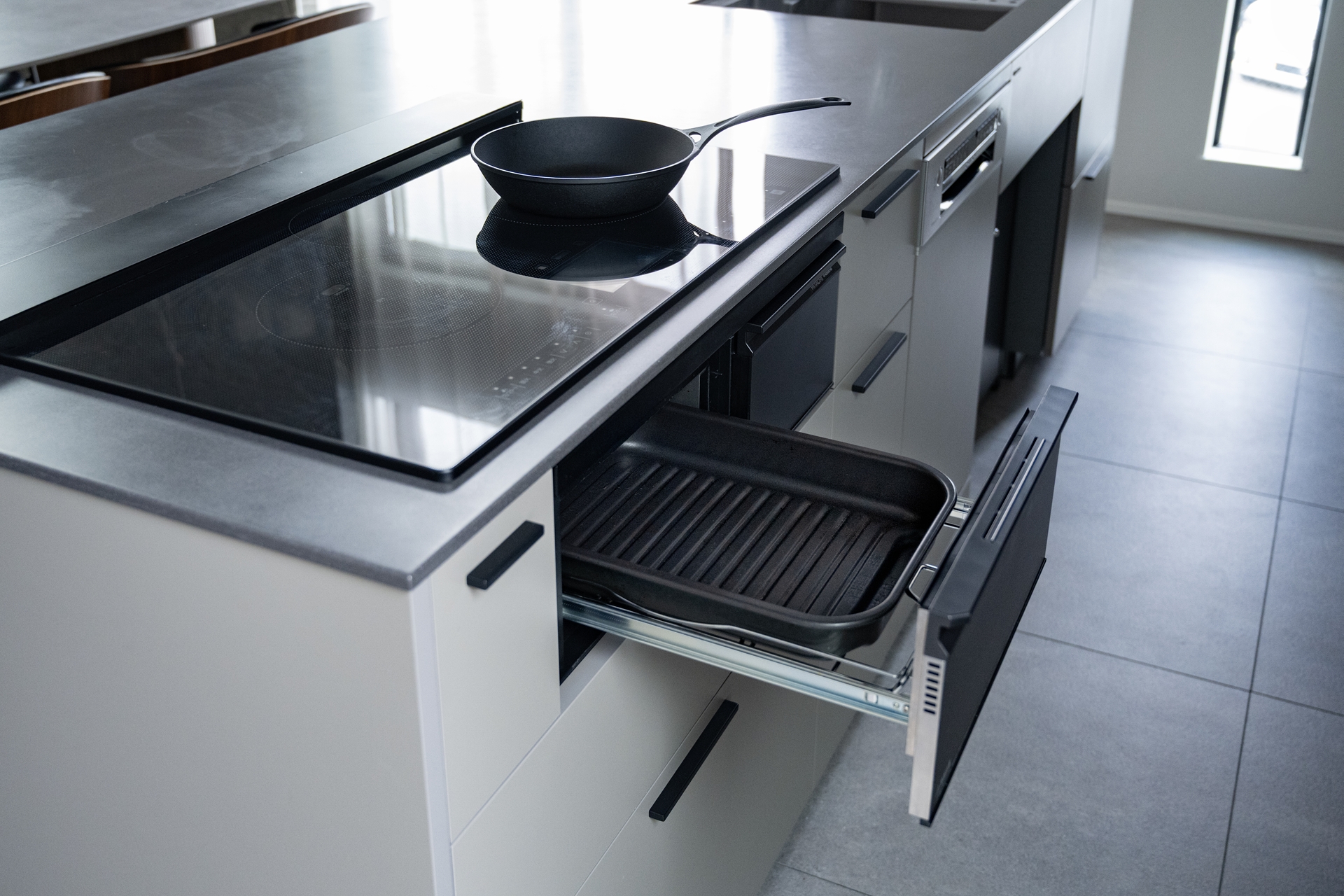 IHクッキングヒーターの下にお鍋の引出しを。深くて大きな収納にするケースが多いですが、まりなさんは浅めの引出しを2段。重ねられるお鍋やボウルをいれています。
