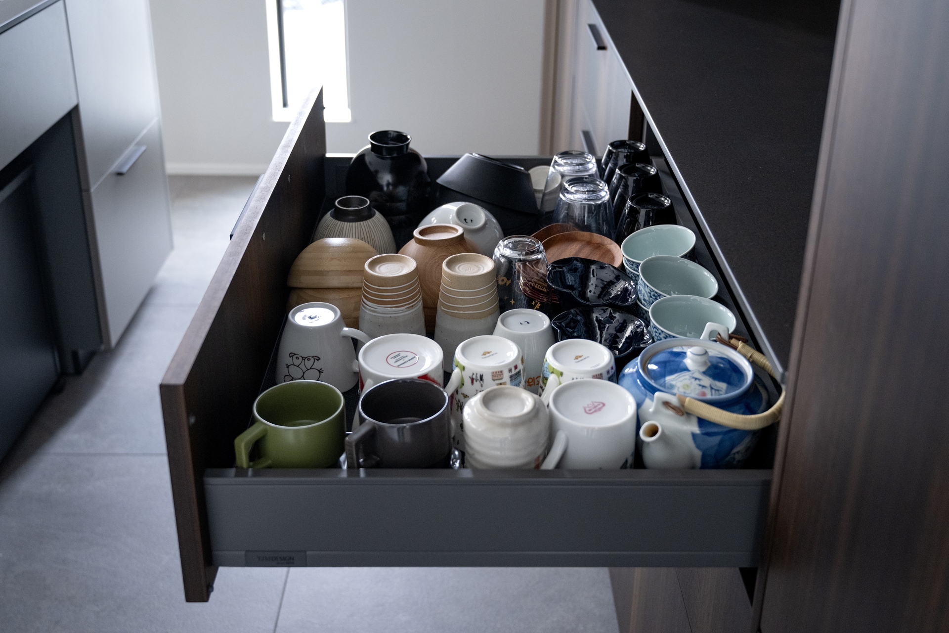 家族5人、食器の数もどうしても多くなります。すべてキッチンの中にしまえるように、計画しました。5人分のカップや湯呑みだけで。もういっぱいです。