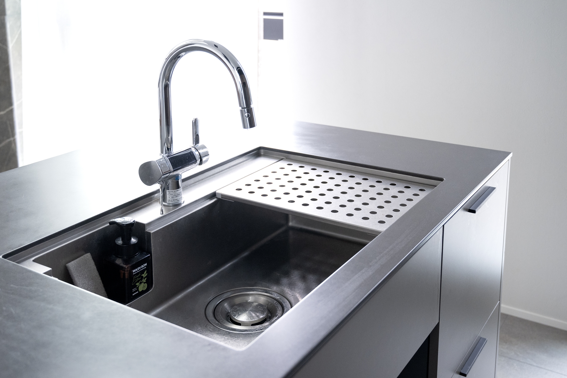 シンクは水切りラックが不要な穴あきプレートを設置し、洗剤置き場もありますから、すっきりと見えます。「子どもが多いと、どうしても雑然としてしまう。キッチンで解決できることはできるだけ、先回りして考えました」と言います。