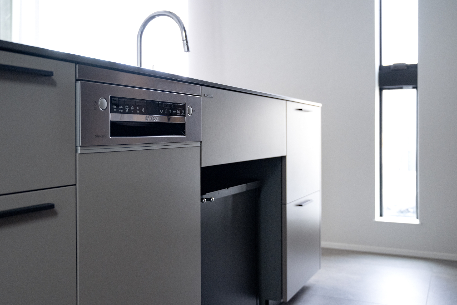 キッチンの裏側もすっきりと。フルオーダーなのですべてを収納にせず、シンク下を開けてダストボックスの場所に。入れるものが決まっていればサイズ指定ができるのも、フルオーダーのメリットです。