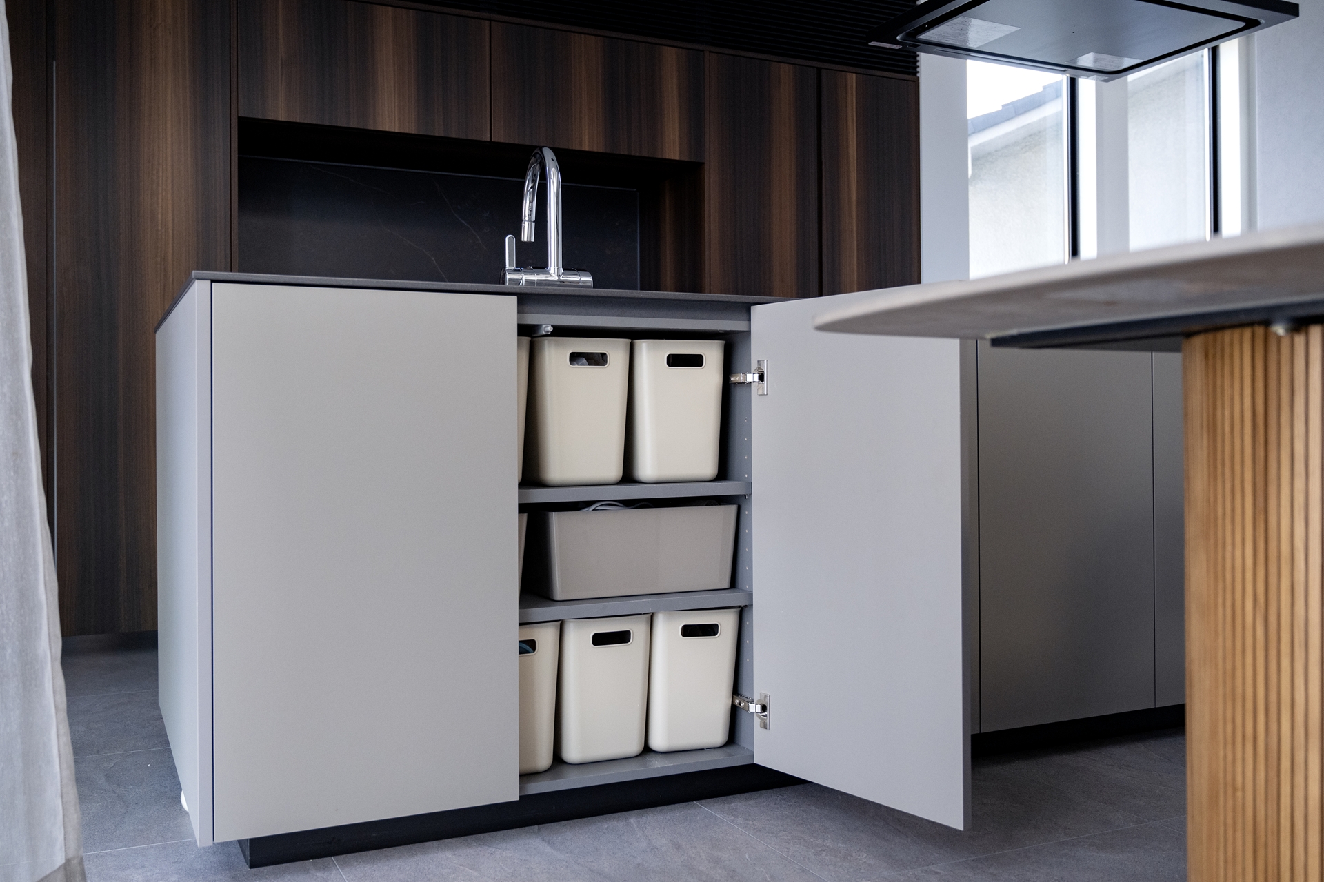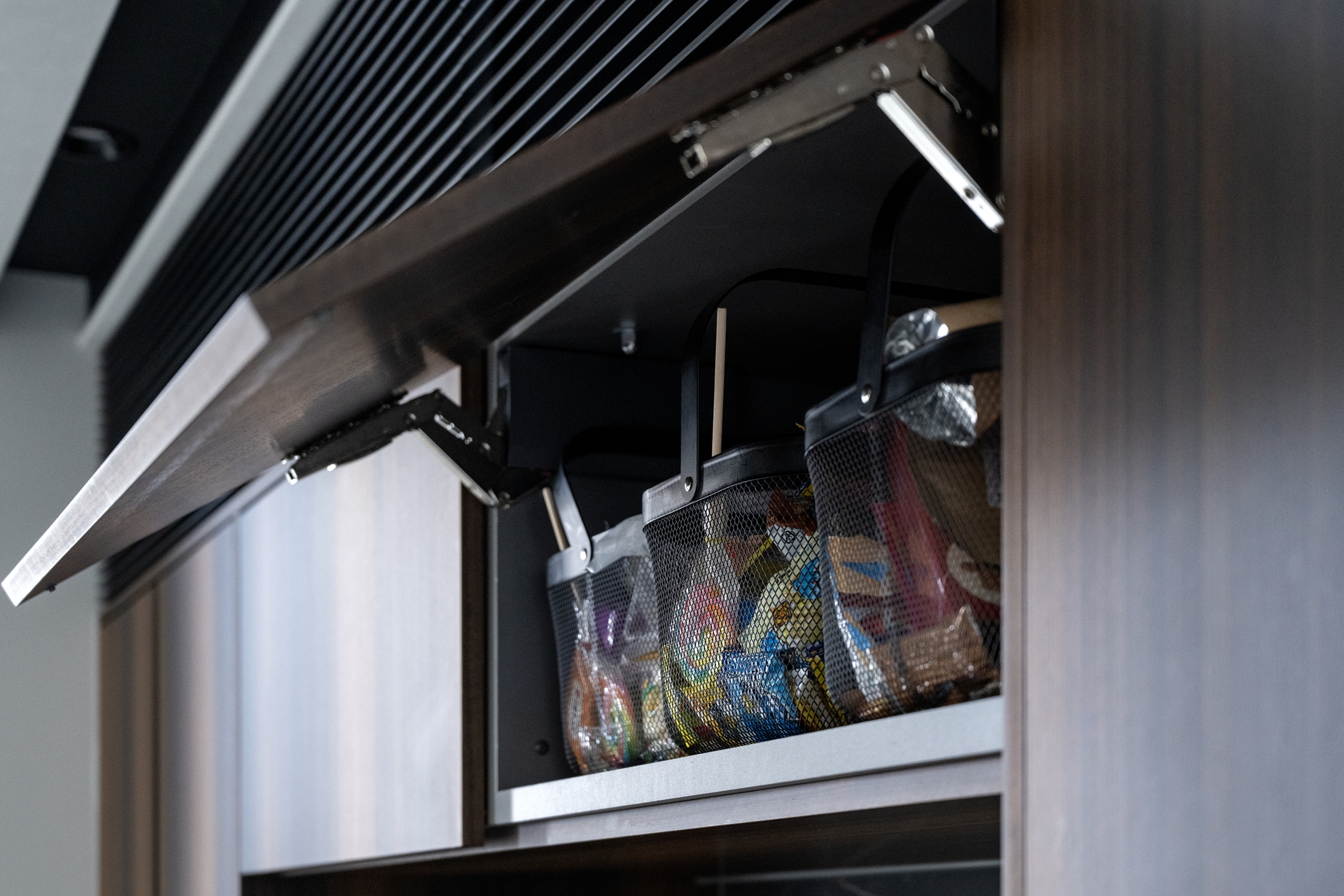「昨日は一緒にシュウマイを作りました。次女は料理が好きで、よく手伝ってくれます」。さらにキッチンには秘密の場所が。子どもたちのおやつがバスケットにきちんと分けられて、しまわれています。実用性だけではなく、キッチンを子どもたちのための「素敵な場所」にするアイデアです。